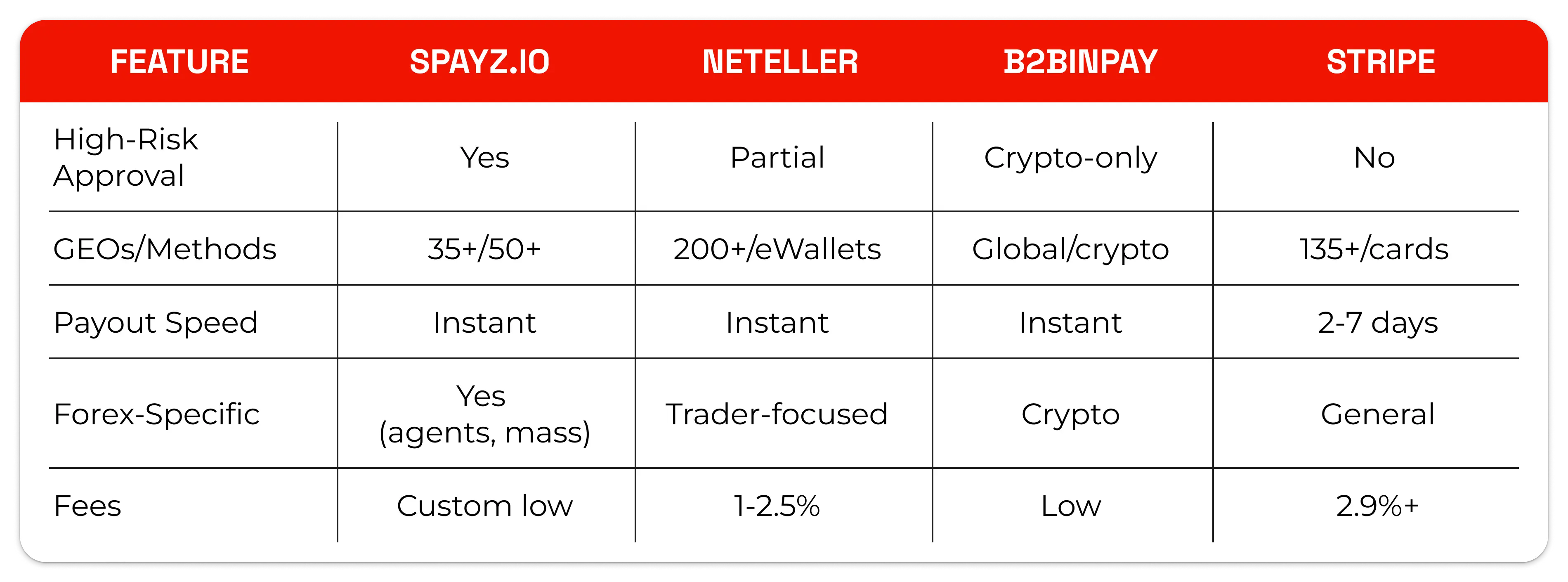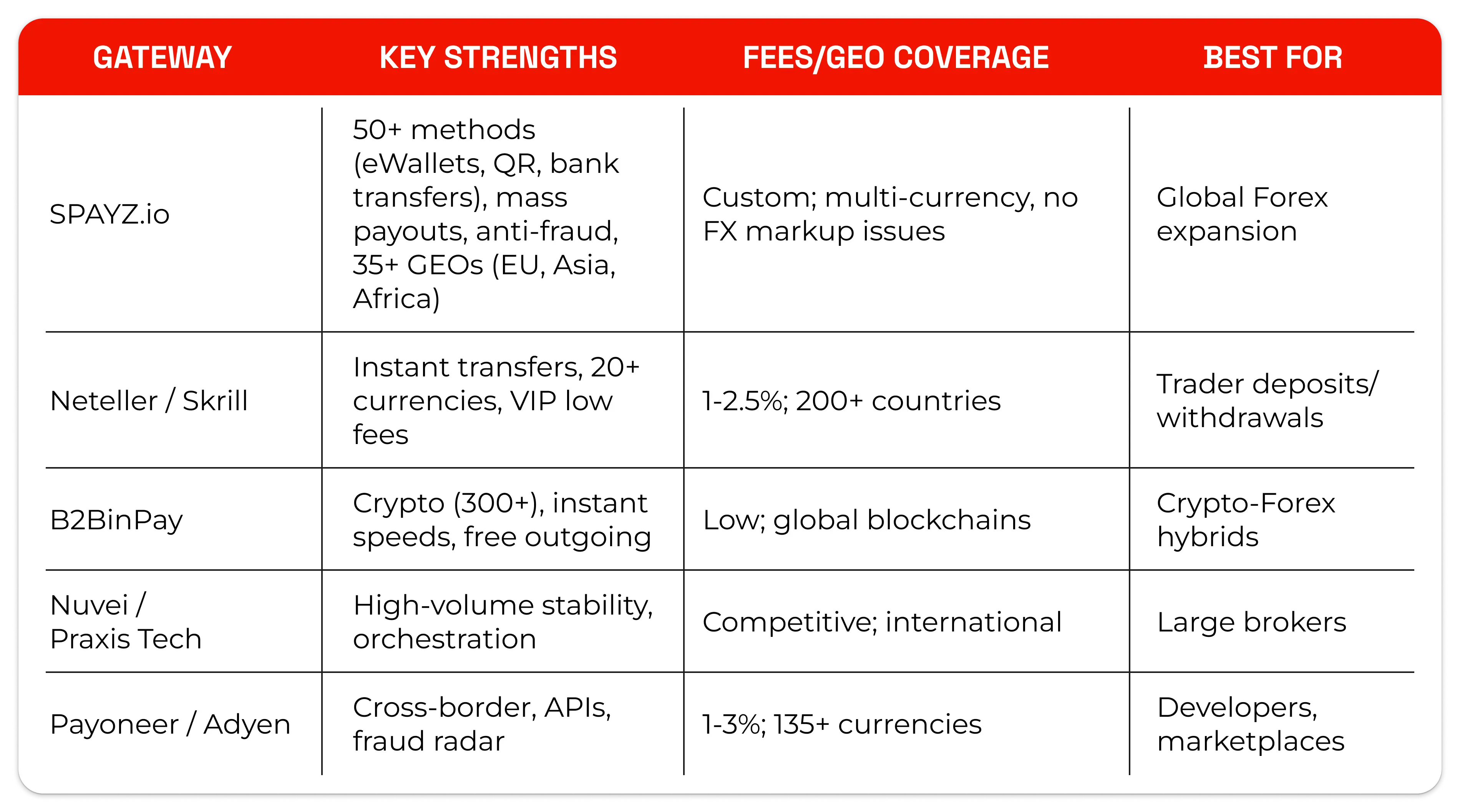 SPAYZ.io stands out as a high-risk specialist for iGaming/Forex, processing 20M+ transactions yearly across the EU, Asia, and Africa. It supports cards, eWallets, QR codes, bank transfers, open banking, and mass payouts — ideal for trader withdrawals.